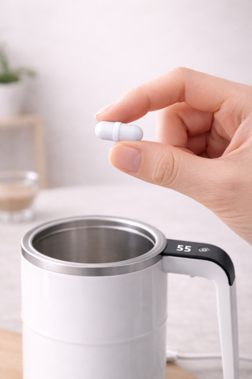 - 自動ミキシング:付属のカプセルで液体を均一にかき混ぜる